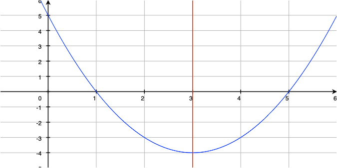 En andragradsfunktions symmetrilinje är alltid vertikal och parallel med y-axeln. Maxi- eller minimipunkten för andragradsfunktionen kommer alltid ligga på symmetrilinjen. Eventuella nollställena till andragradsfunktionen kommer alltid ha samma avstånd till symmetrilinjen, eftersom den ligger i mitten. Vi kan alltså hitta symmetrilinjen med hjälp av att ta medelvärdet på nollställena. I andragradsfunktionen ovan skulle det bli så här
