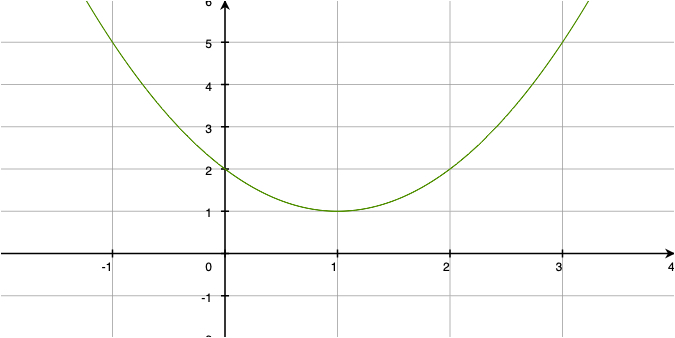 Vi väljer 3 punkter och börjar strategiskt med där grafen korsar y-axeln vilket blir punkten \(0,2\). Sedan tar vi två andra punkter med tydliga heltal som koordinater, som är lättare att räkna med, \(1,4\) och \(-2,4\).
