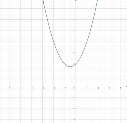 Så kan vi betrakta grafen till denna funktion, som vi kan se här nedan, är intressant, eftersom denna andragradsfunktion inte har några nollställen (det finns inget x-värde som kan väljas så att f(x)=0) - kurvan skär aldrig x-axeln, utan håller sig hela tiden över x-axeln.