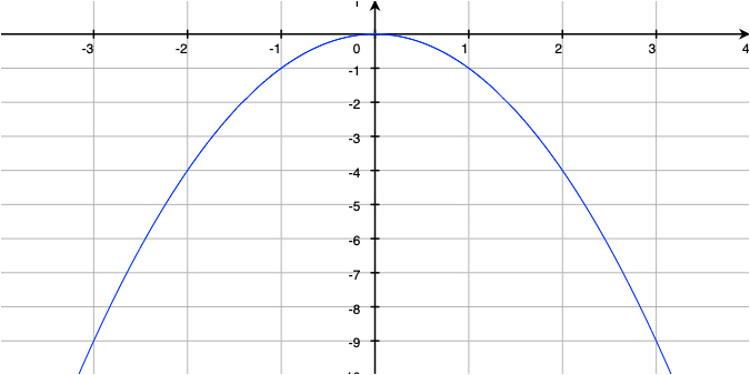 Om x2 i funktionsuttrycket har en negativ koefficient (i exemplet är koefficienten -1) blir kurvan en upp-och-ner-vänd version av kurvan i det förra exemplet, och får en maximipunkt (här i punkten (0,0)).