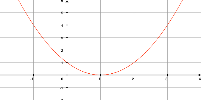 Kurvan ser ut att tangera x-axeln, så att bara finns en punkt på kurvan där y=0 och denna punkt ser ut att vara x=1. Detta kan vi kontrollera genom att lösa motsvarande andragradsekvation: