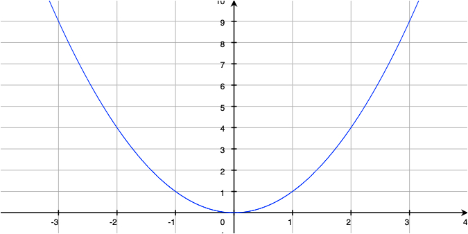 Eftersom x2 i funktionsuttrycket har en positiv koefficient (i vår exempelfunktion är koefficienten 1) får kurvan ett minimivärde (här i punkten (0,0)).
