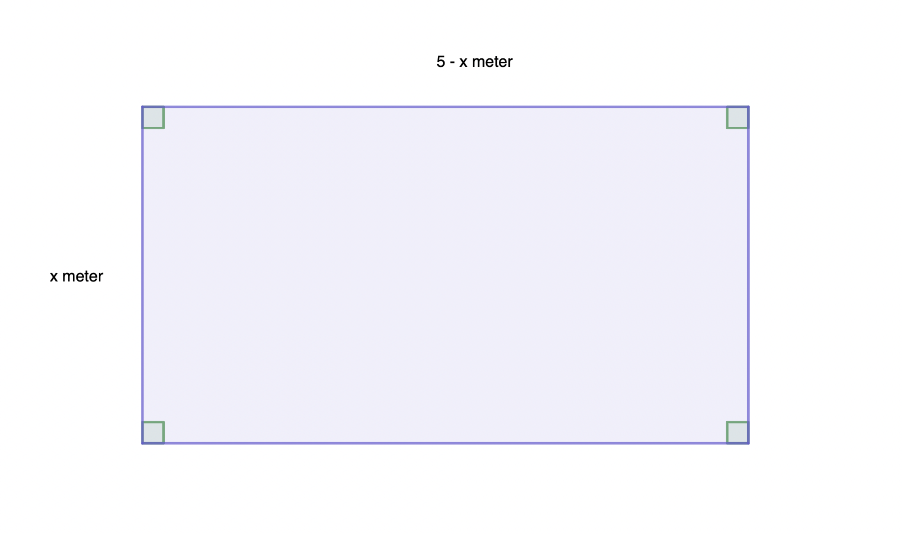Lösning: Vi ritar en figur, där vi döper längden av kortsidorna på rektangeln till x, de har alltså längden x meter. Eftersom omkretsen, summan av alla sidor, är 10 meter blir långsidornas längd tillsammans 10-2x och var för sig blir en långsida 5-x meter.
