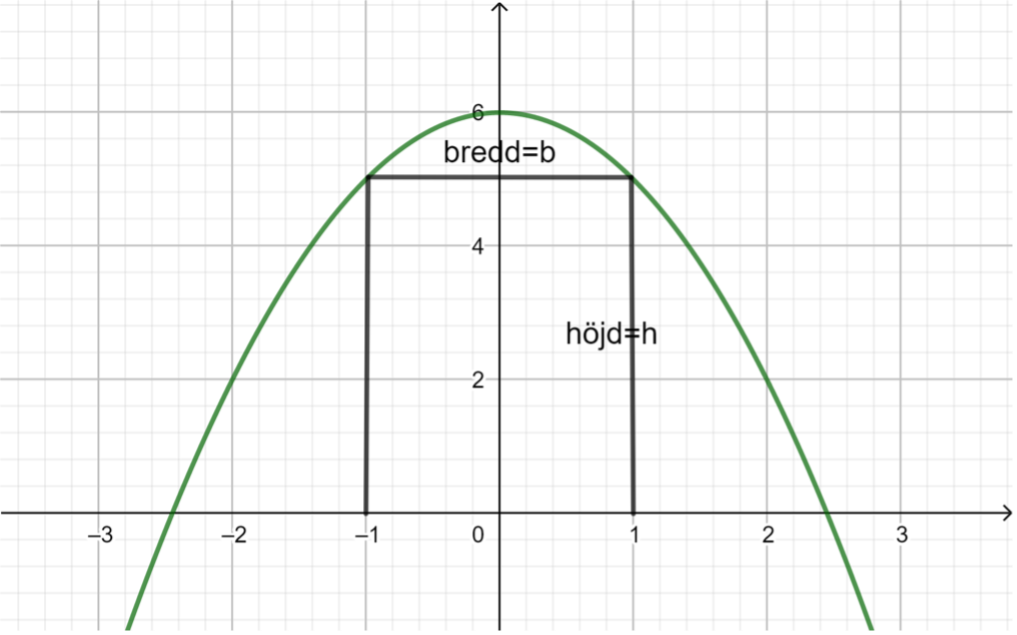 Den markerade fyrhörningen med räta vinklar i figuren nedan är inskriven mellan kurvan \(f(x) = 6-x^2\) och x-axeln, med sina båda översta hörn på kurvan. Kurvan är symmetrisk kring y-axeln. Bestäm fyrhörningens största area \(A_{max}\) samt tillhörande höjd (h) och bredd (b).