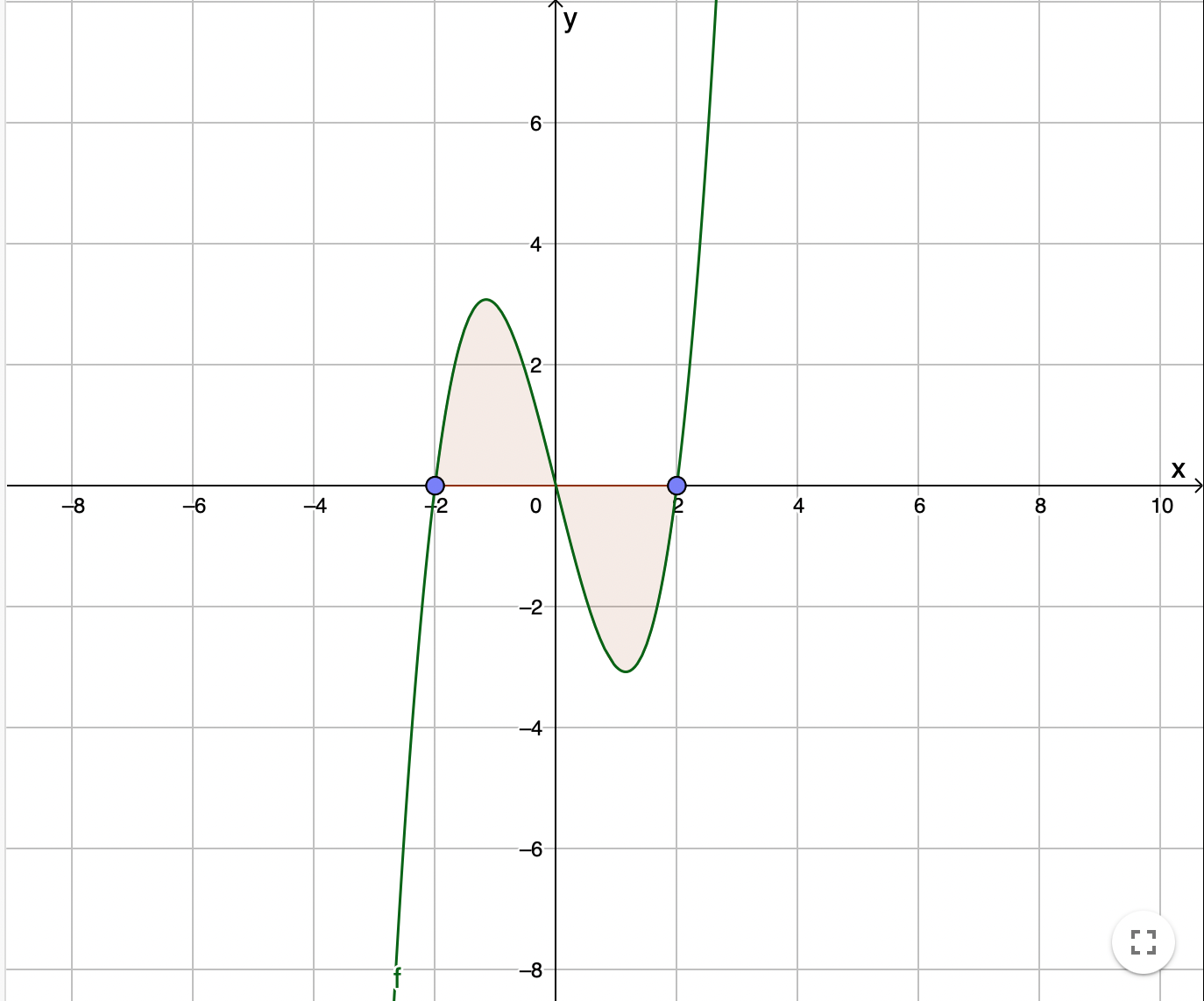 Nästa exempel kommer vi behöva tänka annorlunda. Bilden visar grafen \(f(x) = x^3-4x\) och vi ska beräkna den skuggade arean.