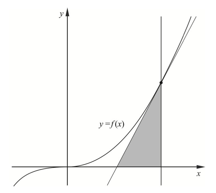 Figuren visar grafen till tredjegradsfunktionen \(f\) som ges av \(f (x) = x^3\) och en tangent till grafen i den punkt där \(x = a\). Tangenten, den positiva \(x\)-axeln och linjen \(x = a\) begränsar ett område som har formen av en triangel.