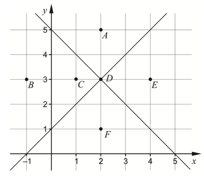Först, betyder \(y>x+1\) att vi vill ha punkter ovanför (och inte på) linjen med positiv lutning som går genom \(y\)-axeln när \(y=1\), det utesluter punkterna D,E och F.