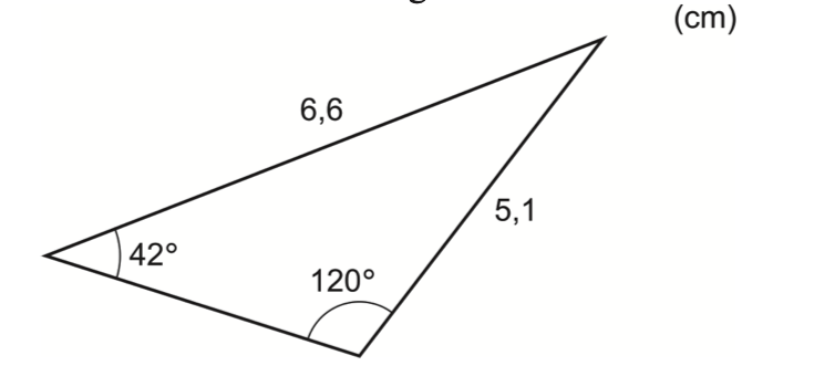 I en triangel är en sida 6,6 cm och en annan sida 5,1 cm. Två av triangelns vinklar är 42° och 120°. Se figur.