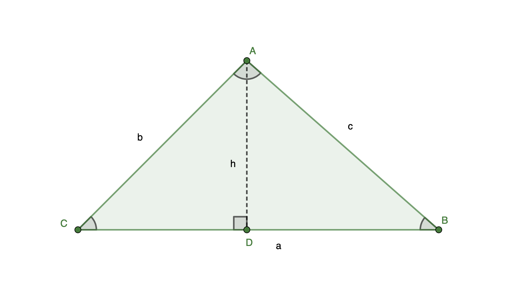 Innan vi går vidare till att se på exempel hur vi använder areasatsen så kollar vi på ett bevis på hur vi kommer fram till areasatsen. Vi börjar med att rita upp en godtycklig (dvs med obestämda mått och vinklar) som vi markerat höjden på.