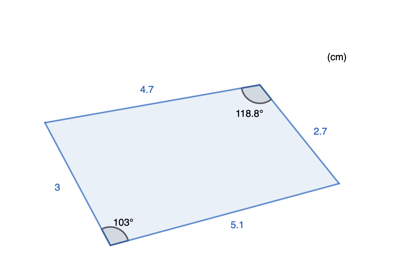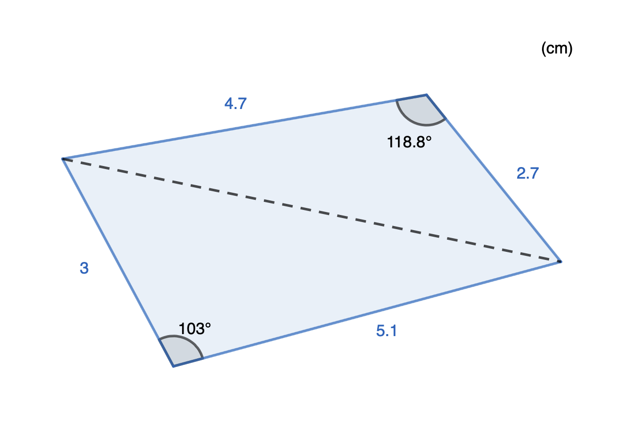 $$Area_2 = \frac{ 4,7\cdot 2,7\cdot \sin(118,8^{\circ})}{2} \approx 5,560 cm^2$$