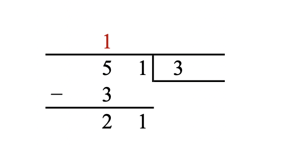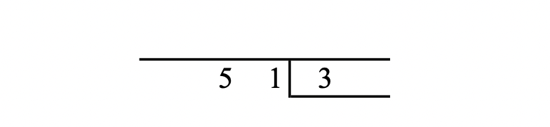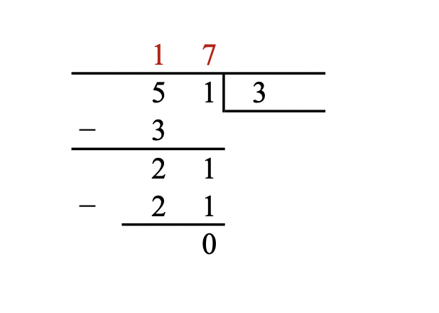 Denna kvot beräknar vi med valfri metod för division, oftast använder vi metoden liggande stolen. För att visa hur detta går till så visar vi först två exempel hur vi dividerar vanliga tal med hjälp av liggande stolen. Här vill vi dela \(\frac{51}{3}\) och då skrivs det ut så här: