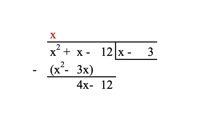 Nu ska vi dela \(4x\) med \(x\) och får därför 4 och skriver denna ovanför. Sedan multiplicerar vi 4 med \((x-3)\) och subtraherar det.