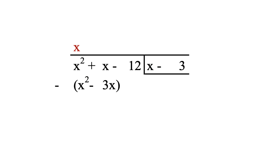 Likt när vi hanterade tal, så tar vi en term i taget. Så vi börjar med att dela \(x^2\) med \(x\) och får ett \(x\) kvar och skriver det ovanför. Nu ska vi multiplicera \(x\) med hela polynomet vi delar med och subtraherar detta från \(x^2+x-12\).