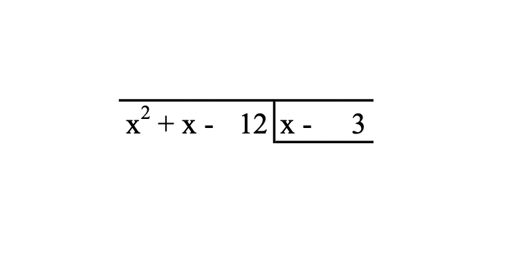 Nu ska vi ta det vi lärt oss och använda det för att dividera polynom. Vi ska dela polynomet \(x^2 + x -12\) med \(x-3\) och skriver därför upp dem så här: