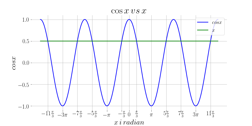 Här är grafiska lösningar för \(-11\frac{\pi}{3} \leqslant x \leqslant​ 11\frac{\pi}{3}\), där linjen \(x = 0,5\) skär med kurvan \(\cosx\).