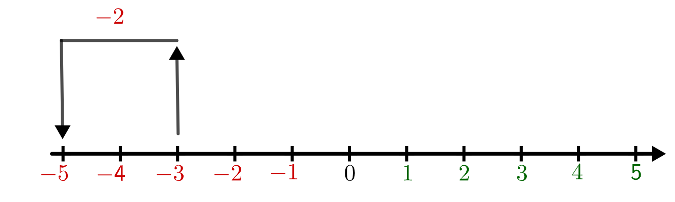 I det här fallet börjar vi vid \(-3\) och drar sedan bort \(2\). Alltså rör vi oss två steg åt vänster längs tallinjen från \(-3\) och hamnar i \(-5\). Är det temperatur vi mäter, så är det alltså samma sak som om temperaturen hade varit \(-3°\)C och sedan minskat med \(2°\)C, vilket ger den nya temperaturen \(-5°\)C.