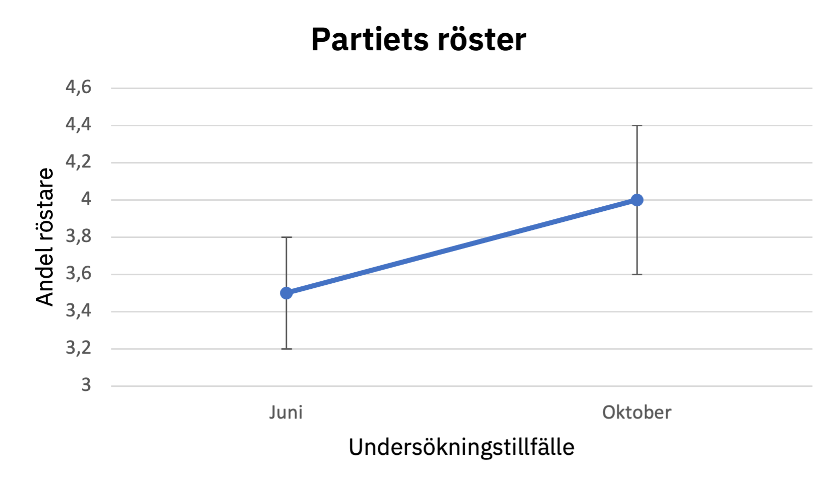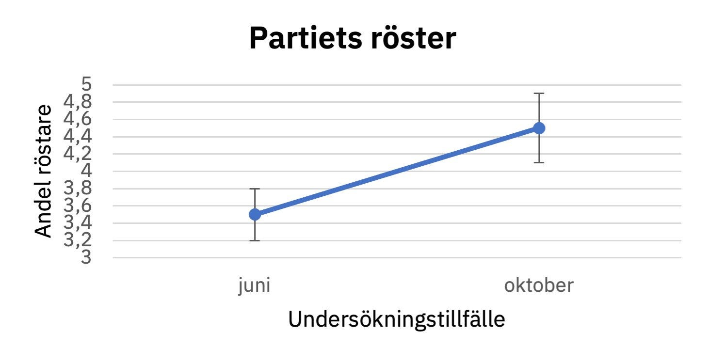 Eftersom konfidensintervallen inte överlappar \((3,8<4,1)\) är svaret ja, ökningen av partiets röster är statistiskt signifikant.