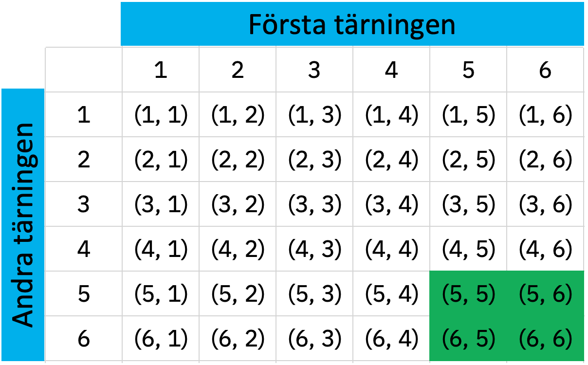 Från tabellen kan vi se att det finns totalt fyra gynnsamma utfall där bägge tärningarna visar fem eller sex.