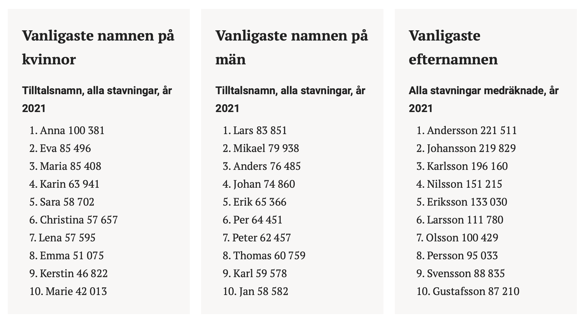 De har också statistik över namn i Sverige och nedan är ett exempel på en tabell de sammanställt över vanligaste namnen i Sverige 2021.