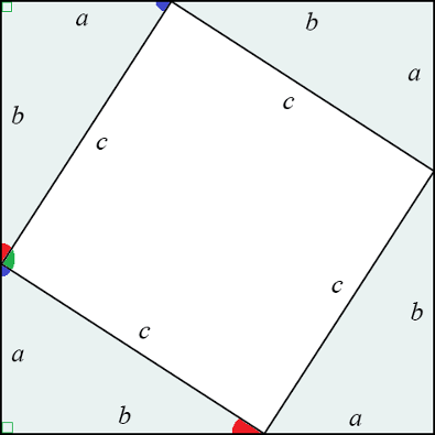 Tittar vi på fyrhörningen i mitten så är alla sidor lika långa (c längdenheter). Vid bevisföring måste vi ofta få fram delsteg för att komma fram till ett komplett bevis. I detta fall hoppas vi att fyrhörningen är en kvadrat. Sidorna är självklart lika stora så allt som är kvar är att övertyga oss själva om att vinklarna är 90 grader.