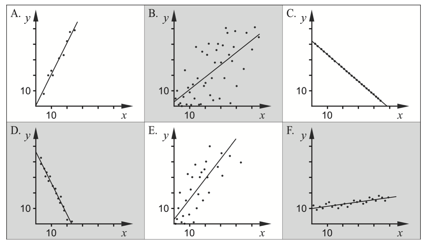 Alternativen A–F visar sex olika spridningsdiagram. Till varje diagram finns även en anpassad linje inritad.