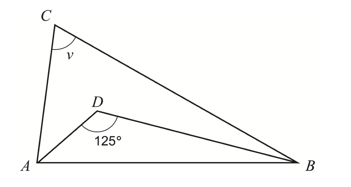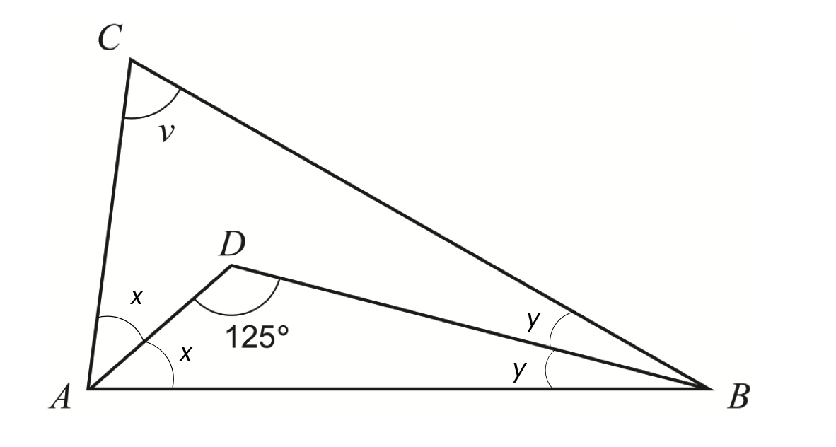 I triangeln ABC dras en bisektris från A och en bisektris från B så att bisektriserna skär varandra i D. Bisektriserna bildar en vinkel som är 125°. Se figur.