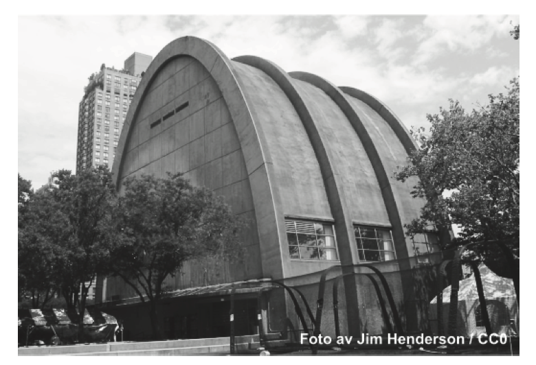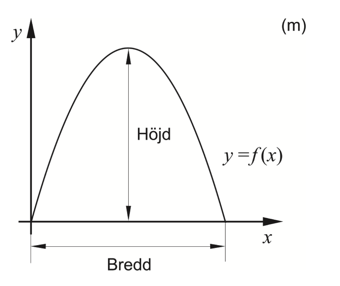Ytterkanten på byggnadens framsida kan beskrivas med grafen till andragradsfunktionen \(f\). Funktionen \(f\) ges av \(f (x) = -0,14x^2 + 3,92x\) där \(x\) och \(f(x)\) har enheten meter och där \(x\)-axeln är placerad på marknivå längs byggnadens framsida. Se figur.