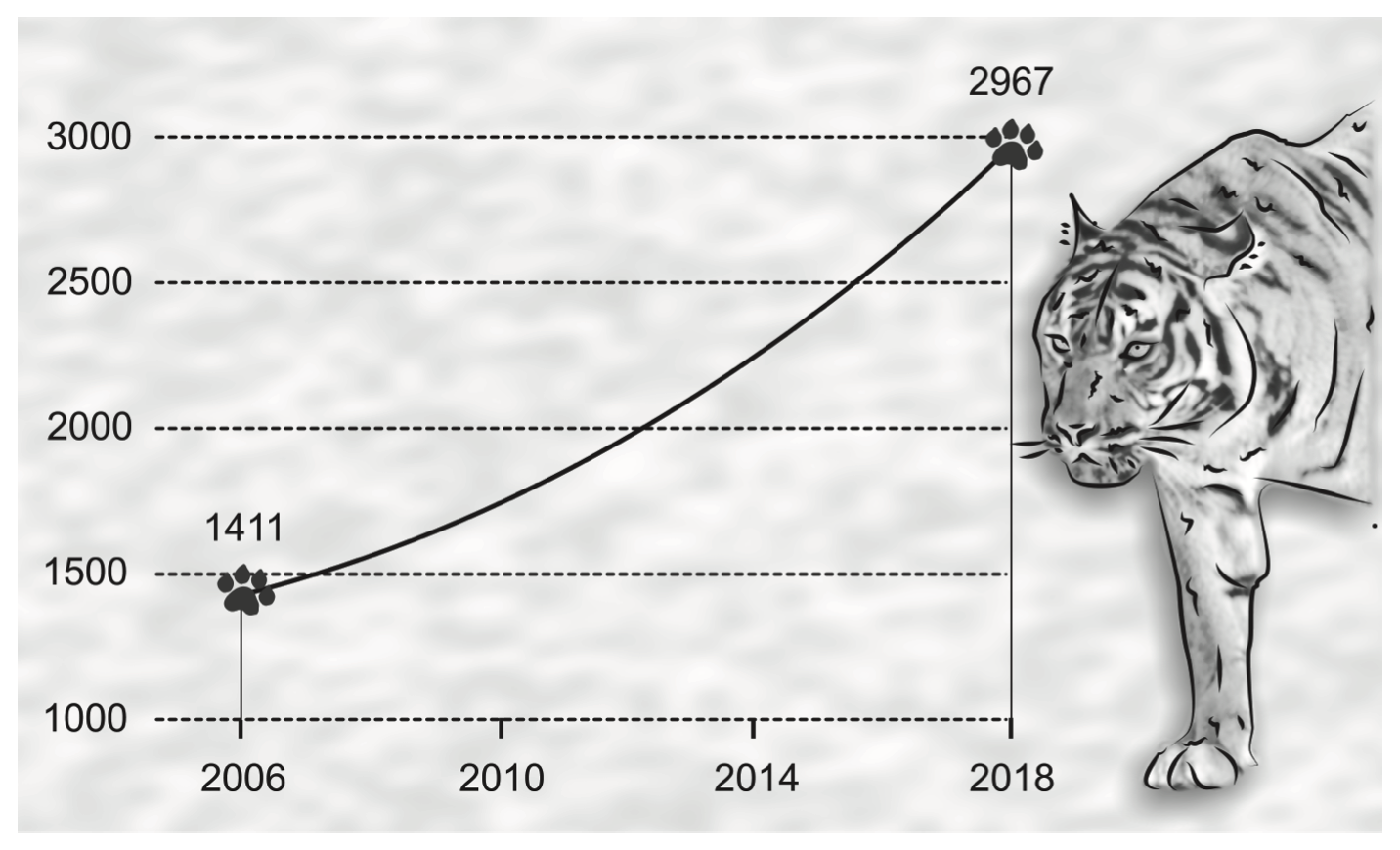 Tidningen Times of India släppte år 2018 nyheten att antalet tigrar i Indien mer än fördubblats sedan år 2006.