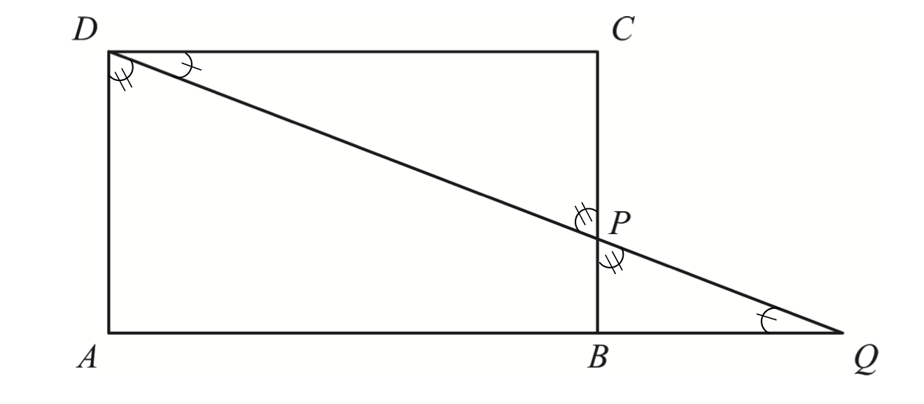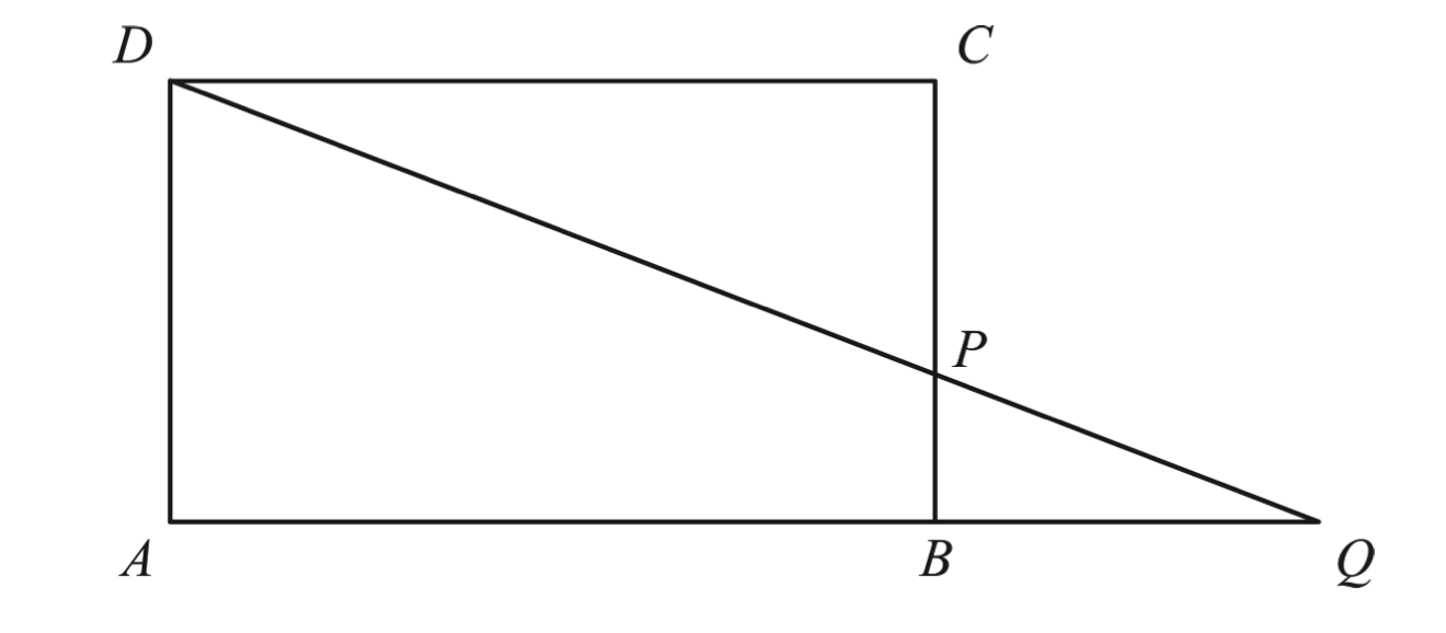 Figuren visar rektangeln \(ABCD\) med en punkt \(P\) på sidan \(BC\). När sträckorna \(DP\) och \(AB\) förlängs skär de varandra i punkten \(Q\).