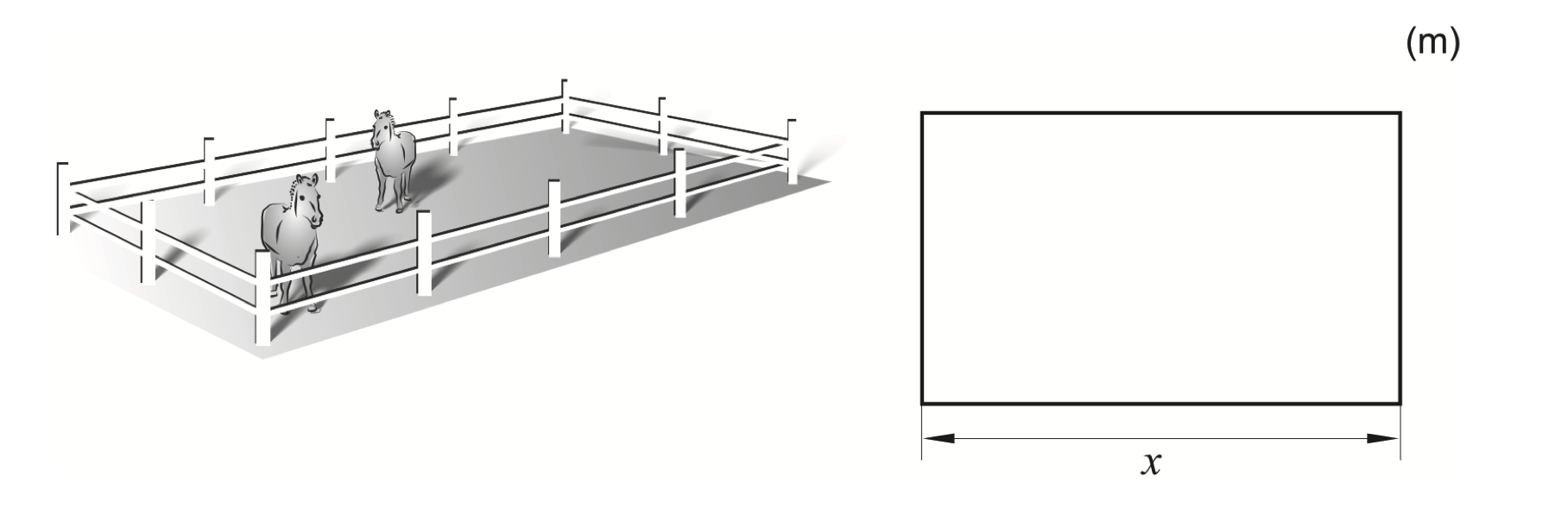Bosse ska bygga en rektangulär hage av 120 meter staket till sina två hästar. Längden av hagens ena sida betecknas med \(x\). Se figur.