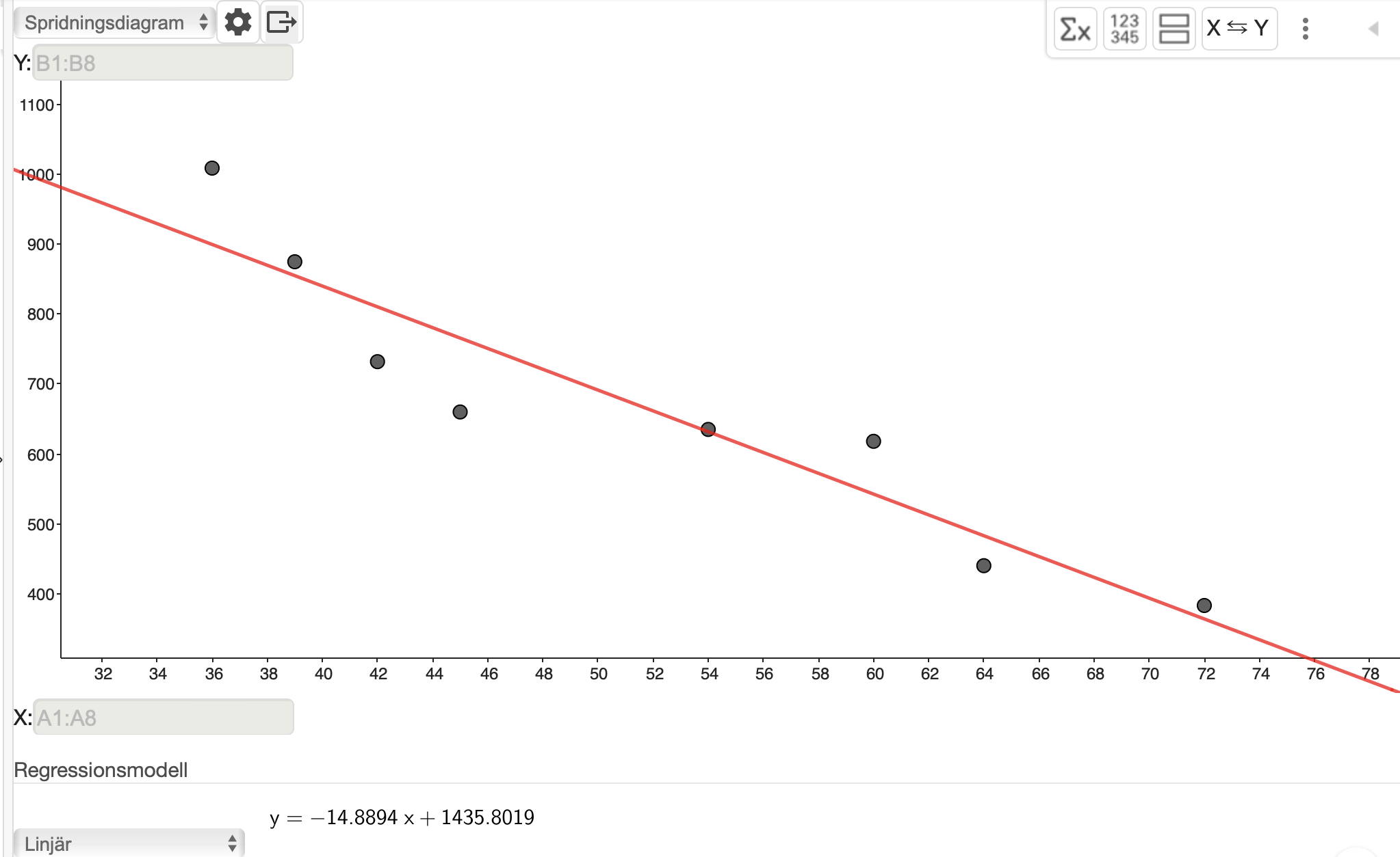 Så svaret blir alltså att linjens ekvation till vår linjära modell är ungefär (avrundat till heltal) \(f(x) = -15x + 1436\) och vi kan se att sambandet motsvarar en negativ korrelation.