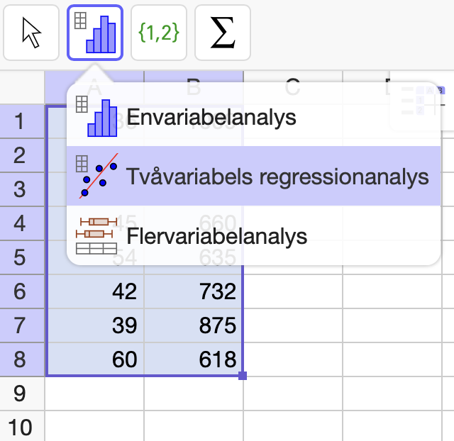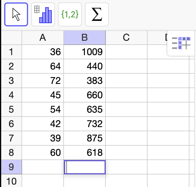 Vi börjar med att öppna GeoGebra, vi kommer denna gång använda Geogebra classic och öppna ett kalkylblad och föra in värdena i tabellen så här.