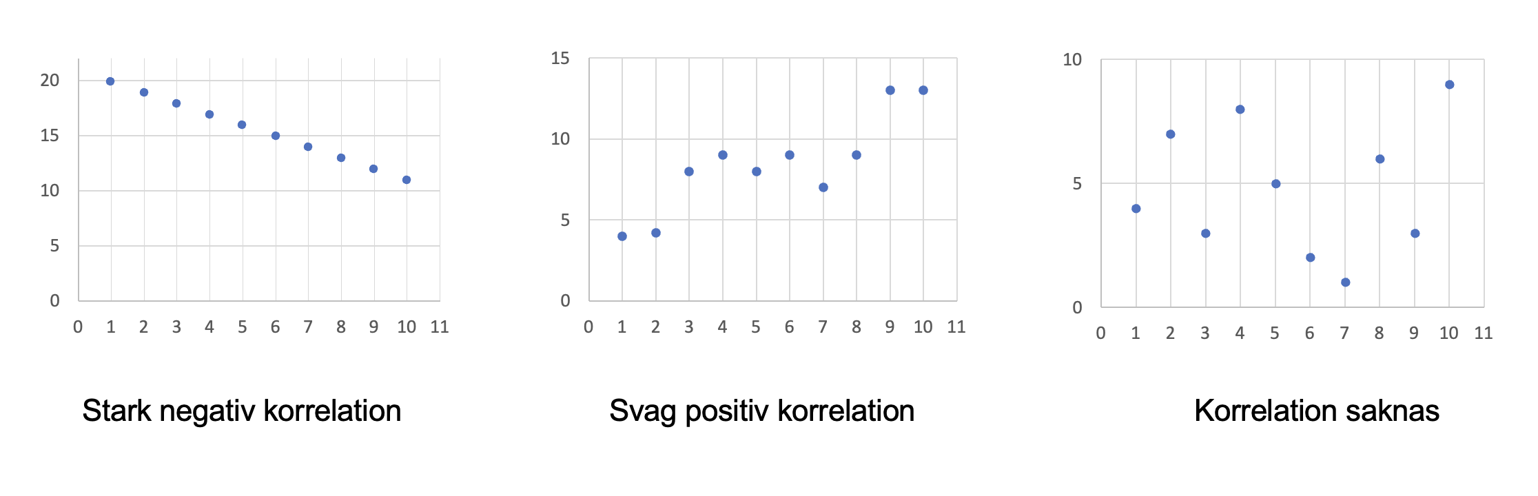 - Negativ korrelation: betyder att om förklarande variabeln ökar så kommer responsvariabeln minska, i ett spridningsdiagram är värdena samlade kring en linje med negativ lutning.