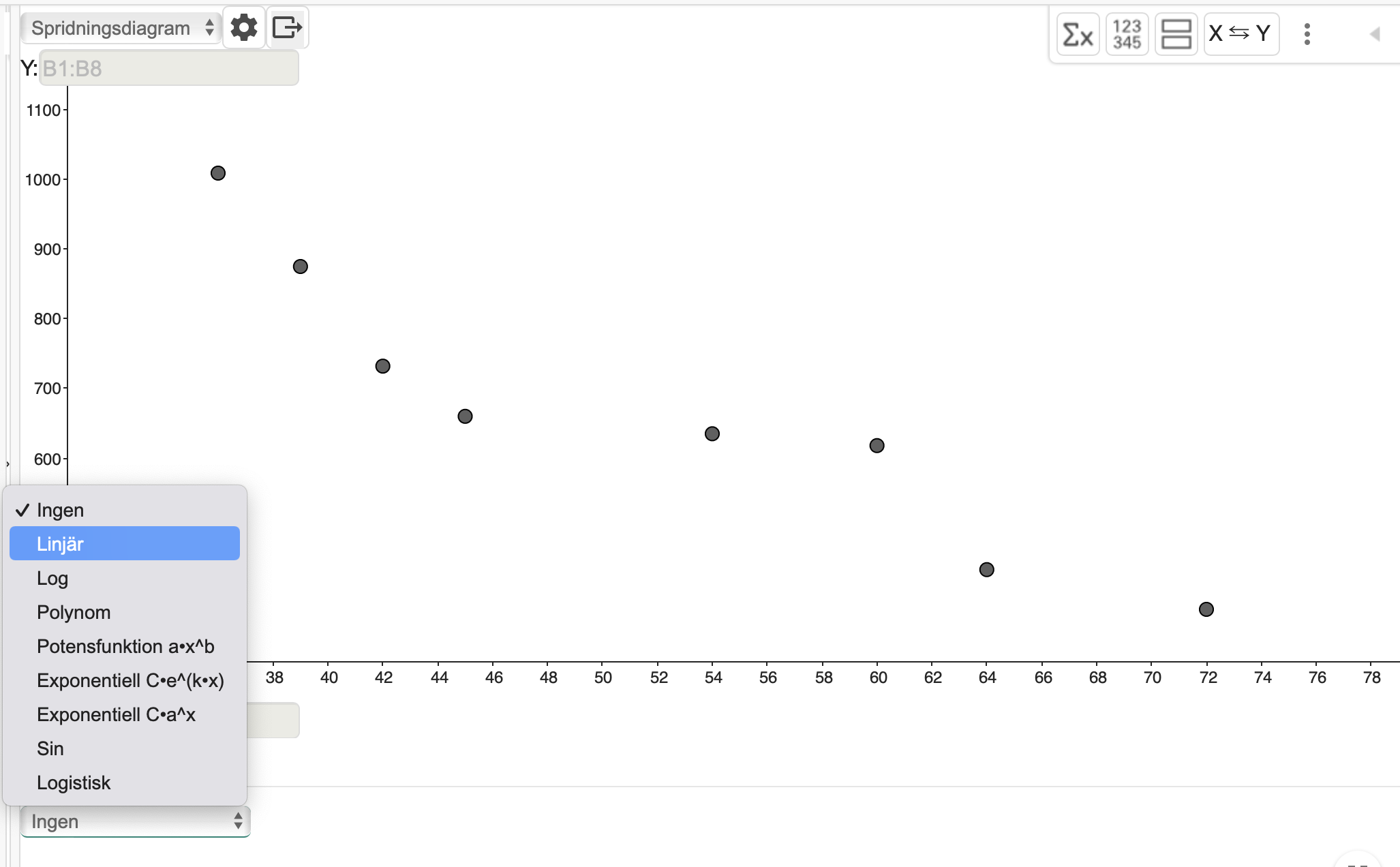 Då skapas vår linje i spridningsdiagrammet direkt och längs ner kan vi läsa av linjens ekvation.