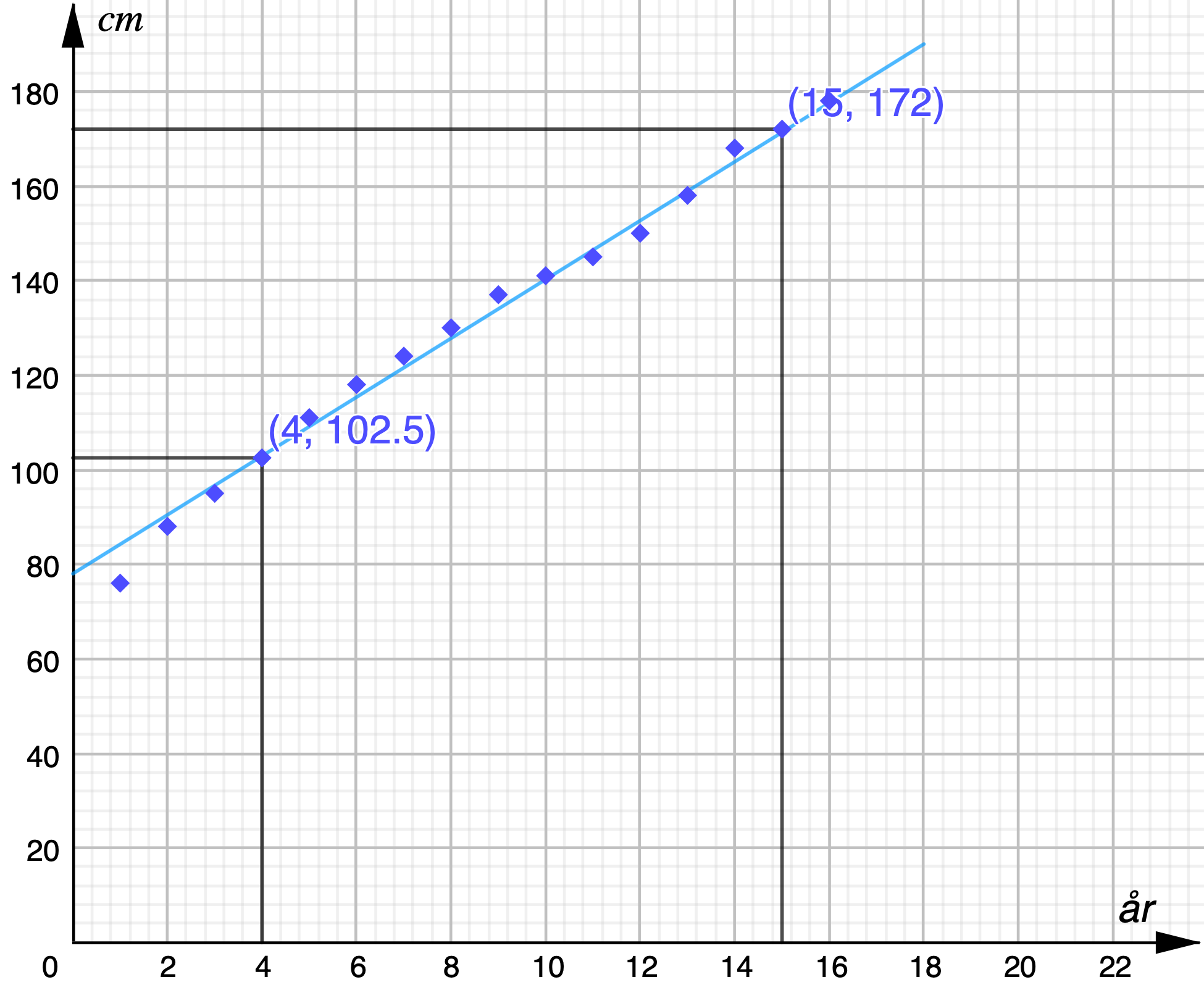 I spridningsdiagrammet ovan har vi markerat de båda punkterna (4; 102,5) och (15; 172).