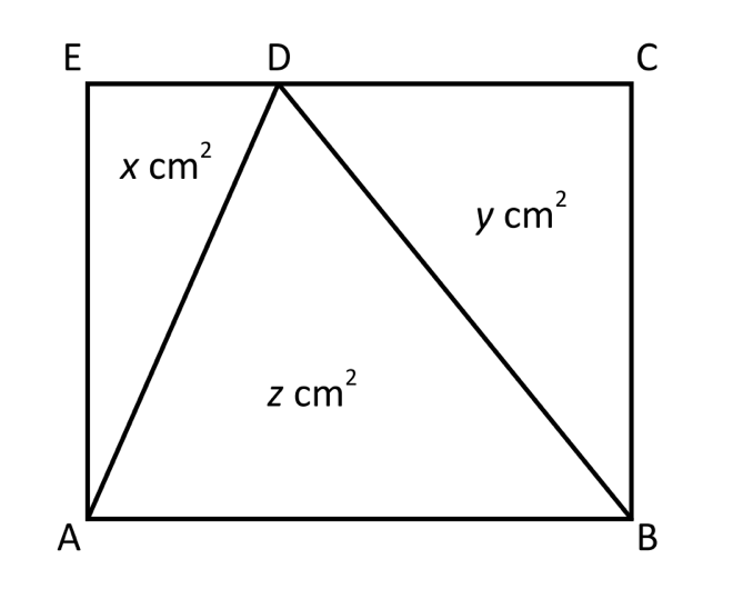 18. Fyrhörningen ABCE är en rektangel. Arean av triangeln ADE är x cm2, arean av triangeln BCD är y cm2 och arean av triangeln ABD är z cm2