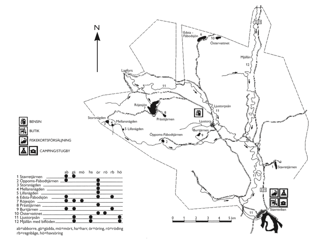 Tittar vi i tabellen över fiskearter, så ser vi att gädda finns i följande fiskevatten: Stavretjärnen, Röjesjön, Burtjärnen, Ljustorpsån och Mjällån med biflöden.