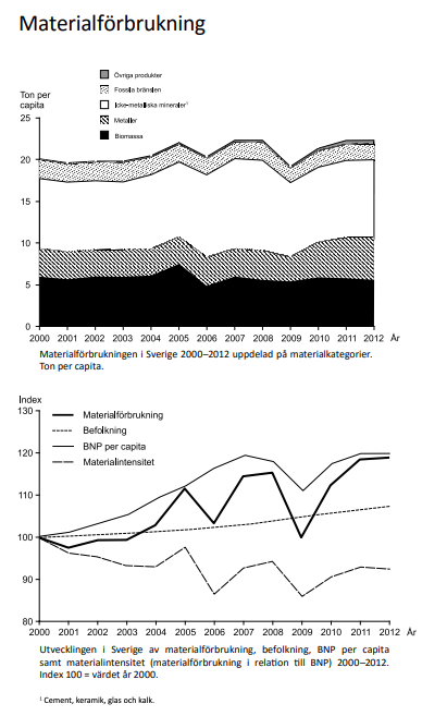 Biomassa utgör cirka sex procent av materialförbrukningen, och fossila bränslen utgör cirka två procent. 6/2 = 3. Förbrukningen av biomassa var alltså tre gånger så stor som förbrukningen av fossila bränslen.