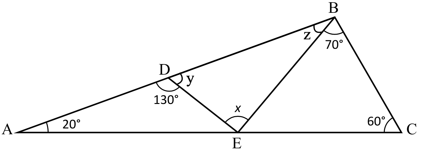Den stora triangeln ABC har följande vinklar: 20, 60 och 70 + z