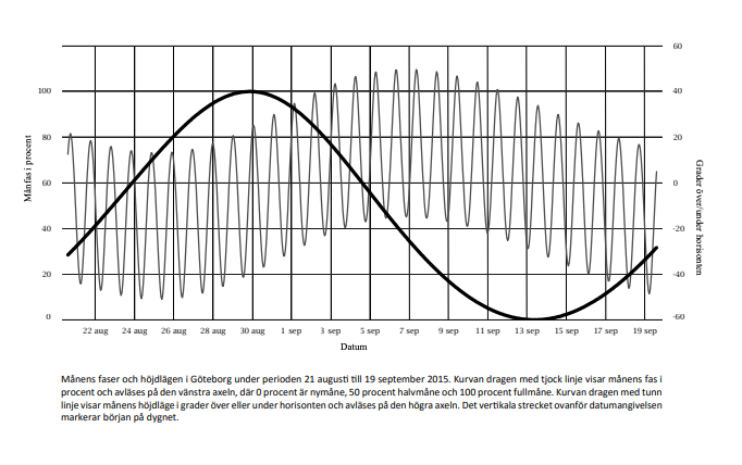 Vi börjar med uppgiften att månen som lägst stod ca 20 grader under horisonten vilket är detsamma som att kurvan med tunn linje måste ligga över – 20 grader under hela dygnet. Det betyder att endast datum mellan 3 september och 10 september kan vara aktuella. Att 10 september tas med beror på att lägsta värdet kan tolkas vara bara aningen under - 20 grader och i uppgiften angavs ca -20 grader. Det betyder att vi kan utesluta alternativ A och D, kvar återstår endast 4 september och 10 september.