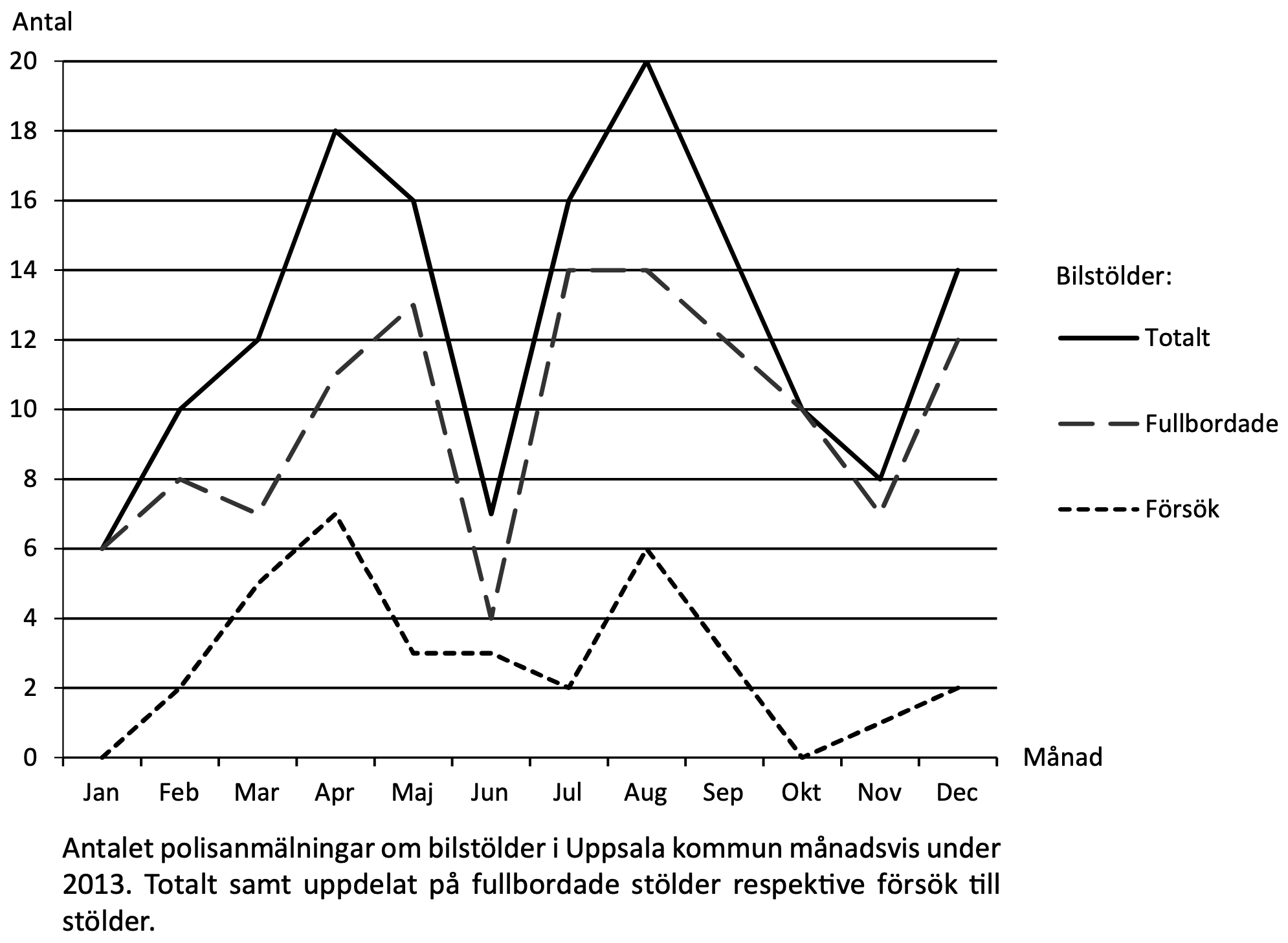 Antalet anmälda försök till bilstöld utgjorde 35–45 procent av det totala antalet anmälningar om bilstöld den månaden, och det anmäldes fler än tio fullbordade bilstölder.