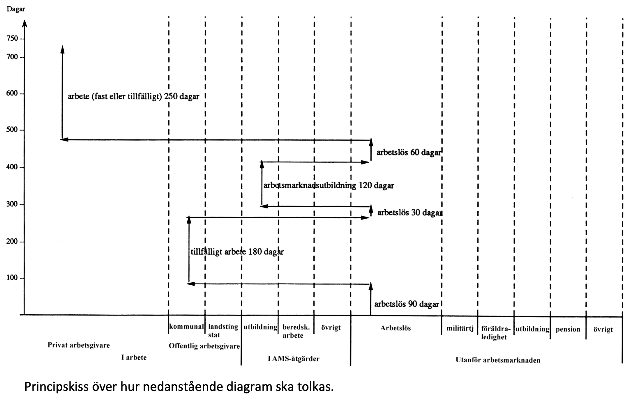 En linje som går vertikalt (upp/ned) markerar att individen befinner sig i denna spalt under det tidspann som går längs y-axeln. Den individ som har längst linjesegment i denna spalt, har varit i arbete hos privat arbetsgivare flest dagar. Individ fyra har varit i arbete hos privat arbetsgivare längst tid, eftersom det linjesegmentet är längst.