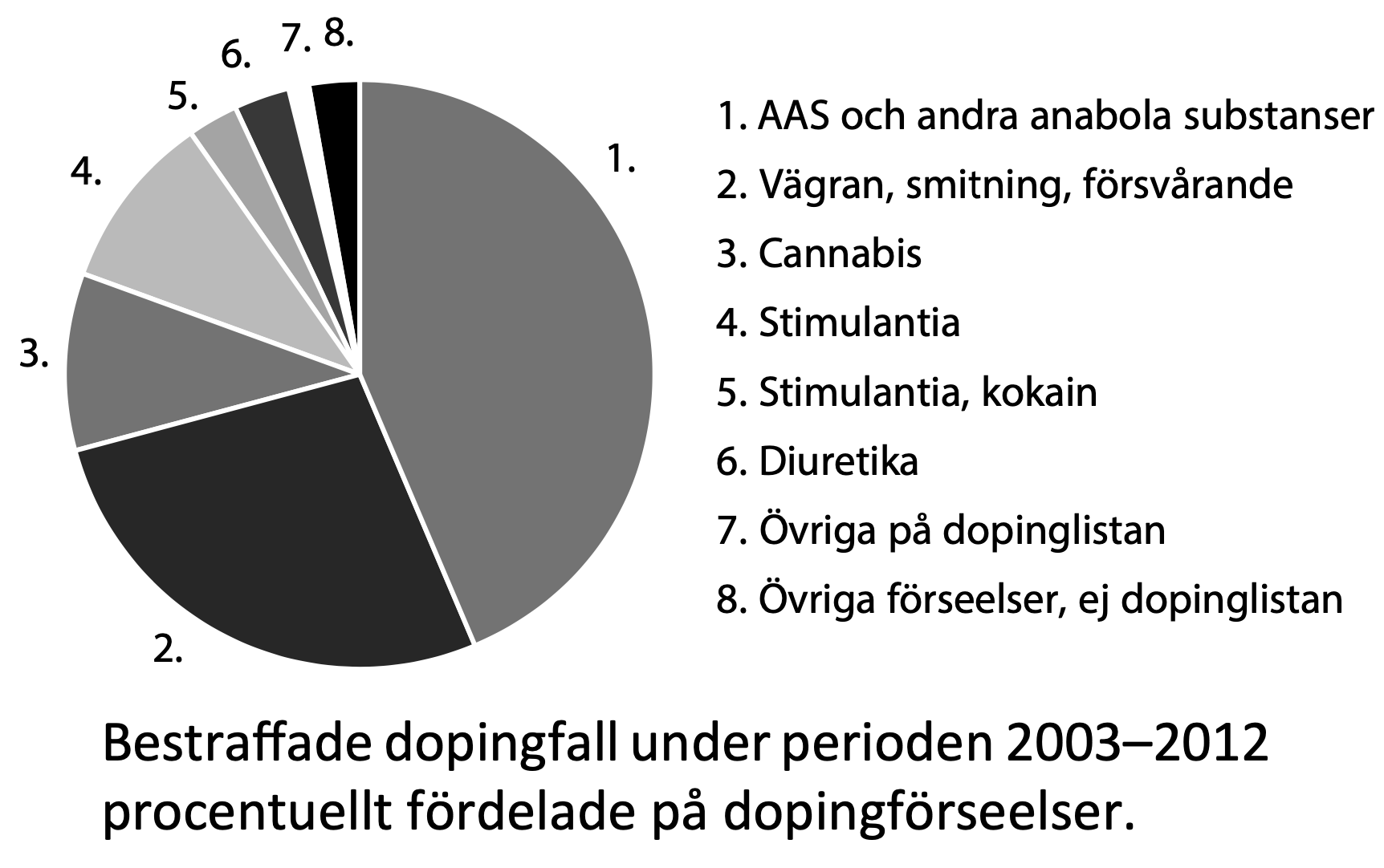 31. Anta att de bestraffade dopingfallen hade samma procentuella fördelning på de olika dopingförseelserna varje år som under hela perioden 2003–2012. Hur många av de bestraffade dopingfallen 2011 gällde i så fall AAS och andra anabola substanser?
