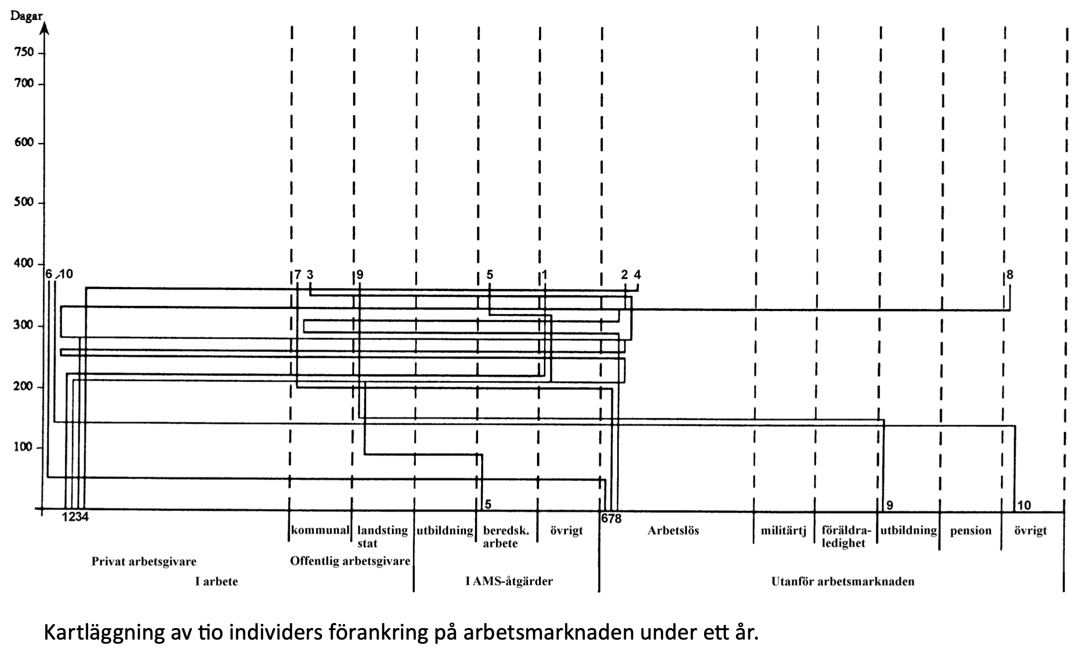 Y-axeln visar dagarna – från dag ett till dag 365. Den spalt längs x-axeln som en individ befinner sig i då y = 365, är där individen befann sig vid årets slut. Titta på spalterna för privat och offentlig arbetsgivare, och räkna antalet linjer som slutar (y=365) i någon av dessa spalter: