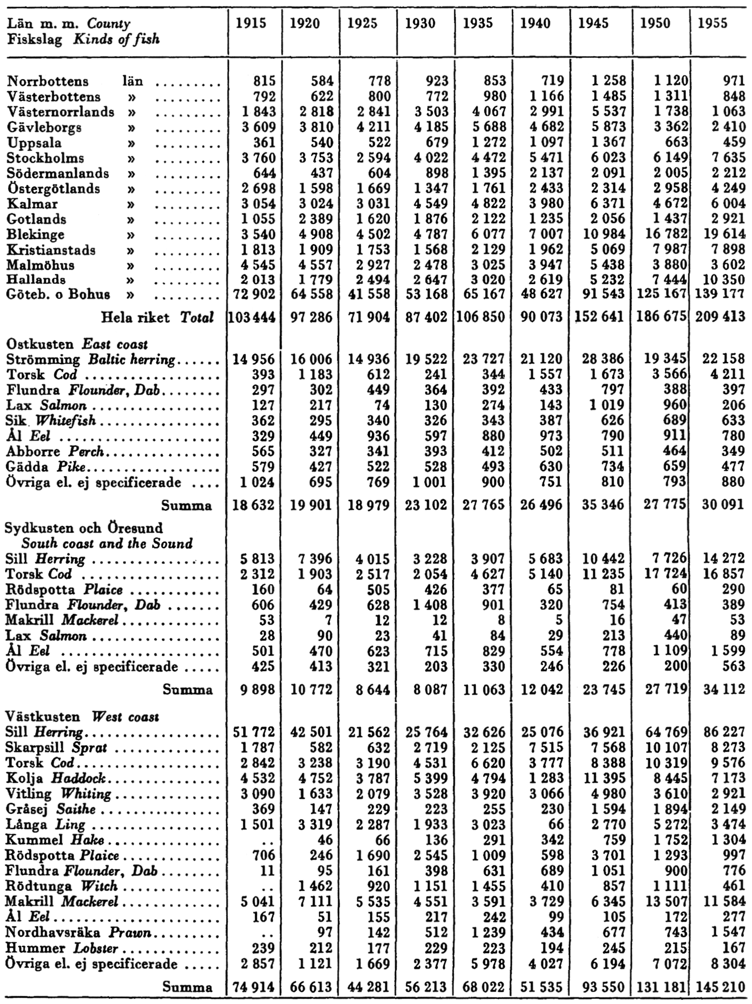 Mängden infångad saltsjöfisk i Sverige 1915–1955, fördelad på län respektive fångstområde och fiskslag. Ton.