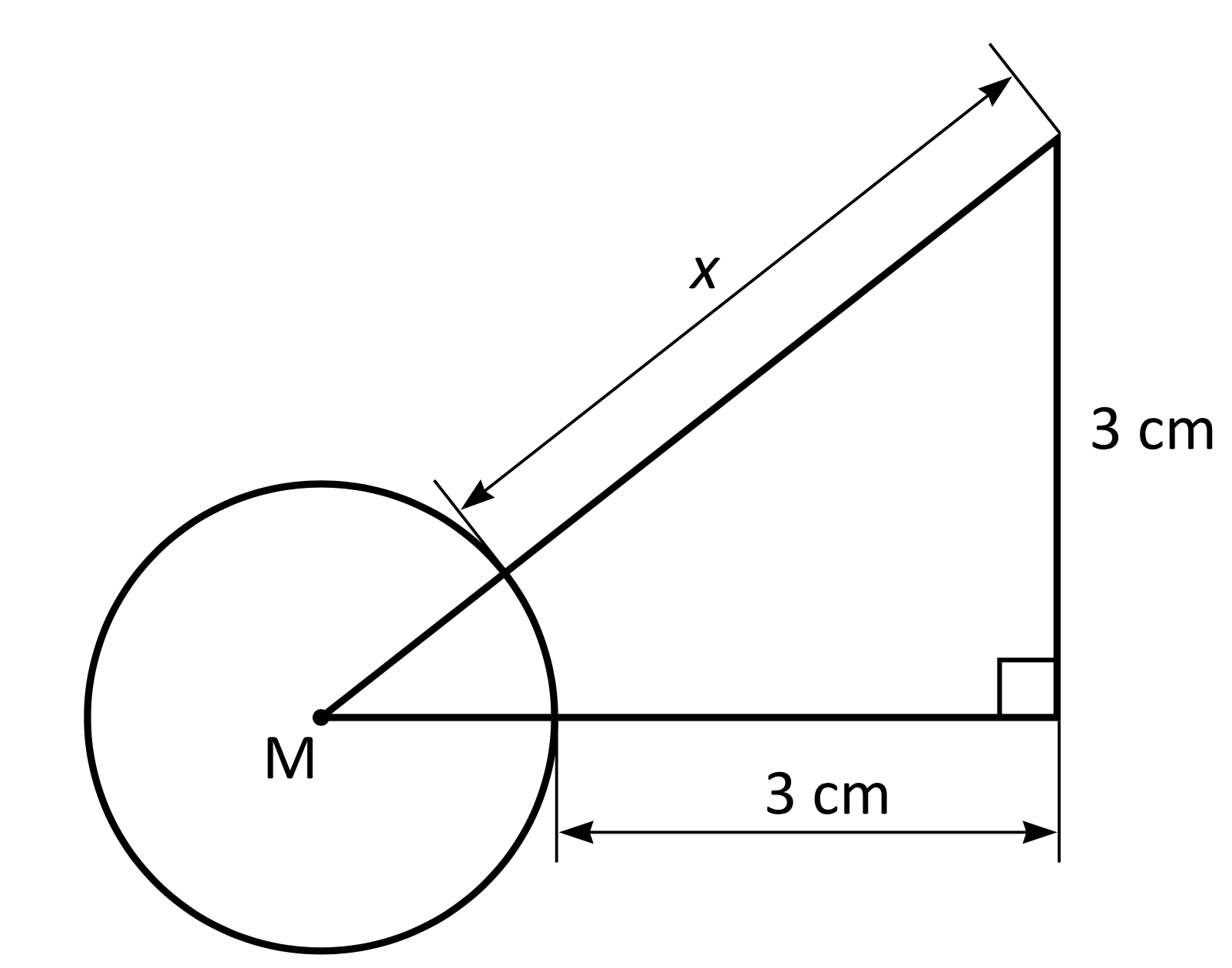 4. Cirkeln i figuren har radien 1 cm. Punkten M är cirkelns medelpunkt. Vad är \(x\)?
