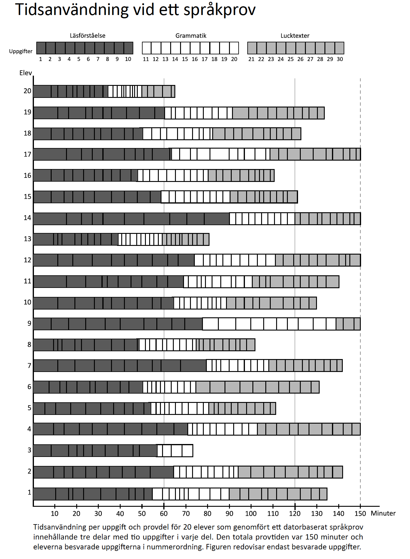 Grammatikdelen är den vita. Mäter vi den för elev 1 (ca 3,4 cm), 8 (ca 2,6 cm), 10 (ca 2,4 cm) och 14 (ca 2,9 cm) så ser vi att elev 10 var snabbast (kortast sträcka motsvarar den kortaste tiden).