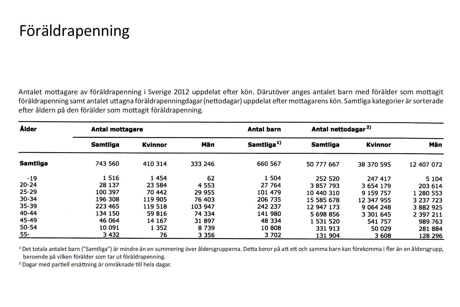Under 2012 togs det ut dagar för 660 567 barn. Totalt var det 50 777 667 dagar som togs ut. Alltså var det 50777667/660567 ~ 76.9 dagar per barn som togs ut.