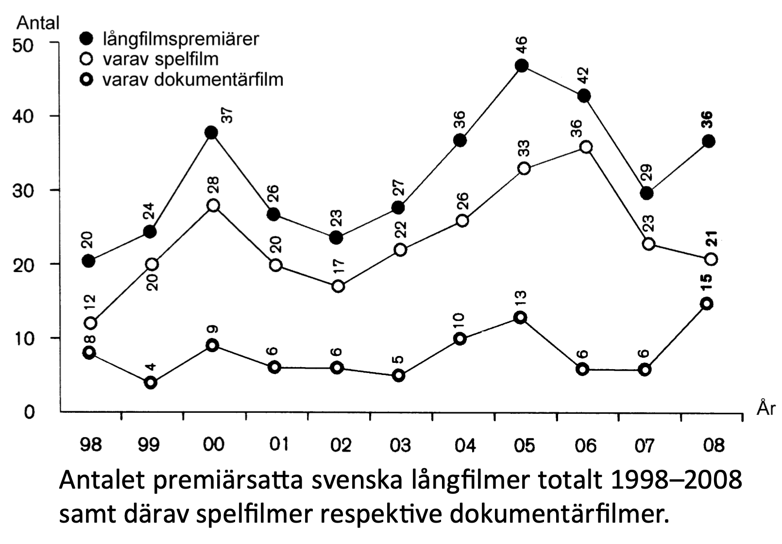 Markera de tre högsta antalet premiärsatta svenska långfilmer, och de tre högsta besökstalen i det översta respektive mittersta diagrammet: