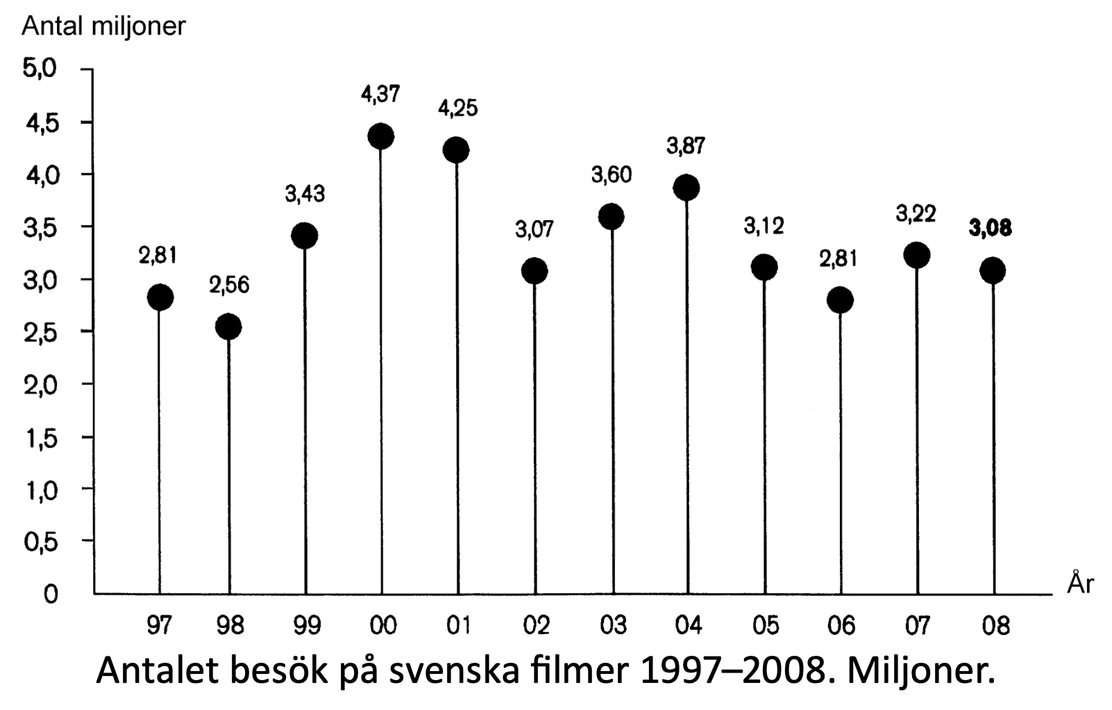 36. Anta att samtliga besök på svenska filmer gällde premiärsatta långfilmer. Hur många besök hade en svensk långfilm i genomsnitt 2007?